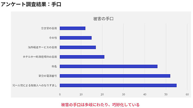 不正者が行う不正注文の手口も多岐にわたり、巧妙化していることがアンケートでわかった。最も多いのは同一人物が複数人になりすます手口で、次に多いのが架空の電話番号を使用するケースだ。