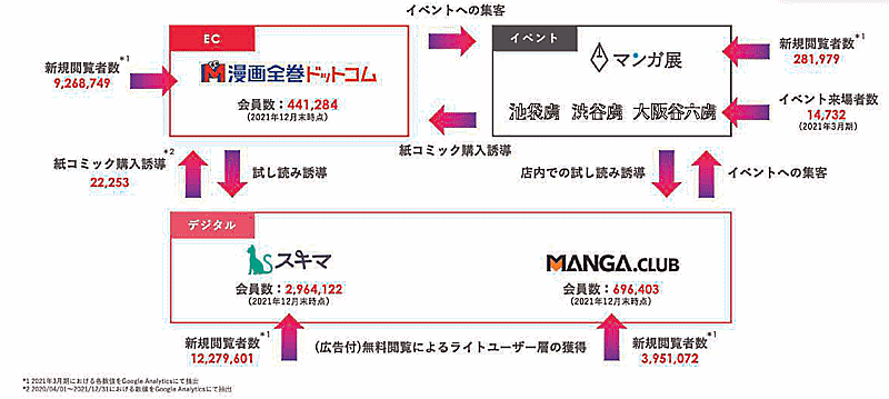 マンガを軸としたサービス横断による相乗効果も見込む。紙コミック、電子コミック、マンガ関連イベントと多面的なサービスを提供しており、消費者とのさまざまなコンタクトポイントを持つ。各サービス間のユーザーの循環によって継続的な価値を提供し、長期的な収益の獲得をめざす。