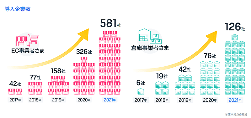「LOGILESS」は2017年2月にサービスを開始、EC事業者と倉庫事業者向けにプロダクトを提供している。導入企業数はEC事業者が約580社、倉庫事業者が約120社に増加、2021年に「LOGILESS」を通じて出荷された荷物は1500万件を超えた。