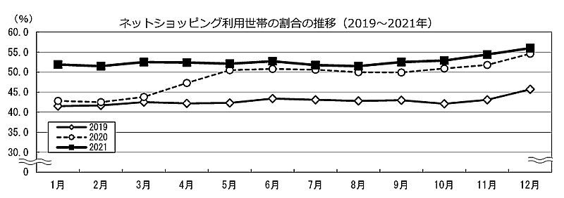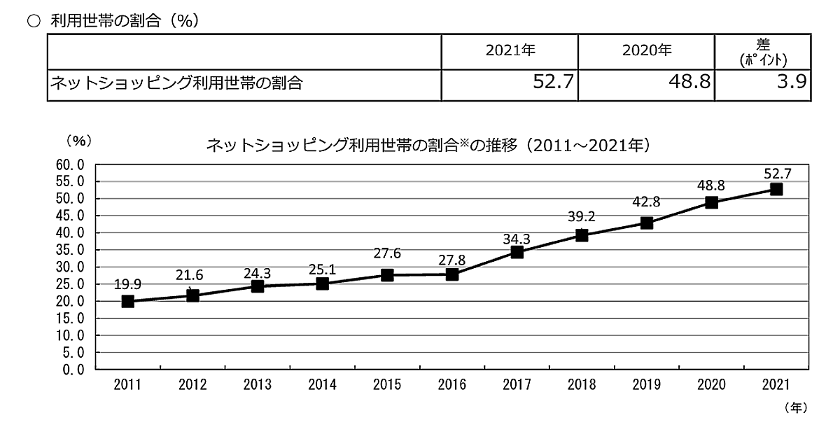 総務省が公表した「家計消費状況調査(2021年)」によると、2021年におけるネットショッピング利用世帯(2人以上の世帯が対象)の割合は年平均で52.7%に達した。