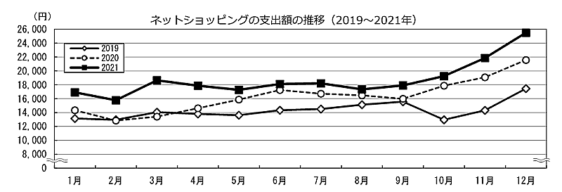 ネットショッピング支出額の月次推移を見ると、2021年12月は2万5507円。2020年12月と比べて名目増減率は18.2%増。