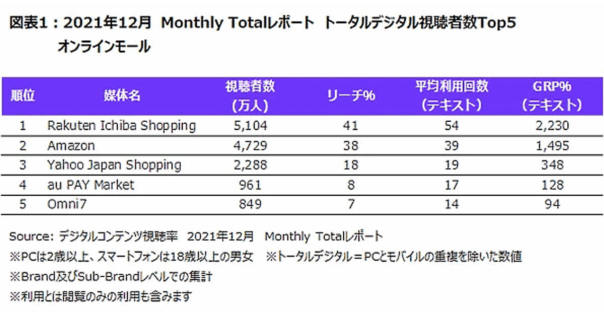 ニールセン デジタルが発表した2021年12月におけるECモールの利用状況によると、PCとモバイルの重複を除いたトータルデジタルで最も視聴者数(2歳以上)が多かったのは「楽天市場」で5104万人が利用、「Amazon」が4729万人、「Yahoo!ショッピング」が2288万人だった。