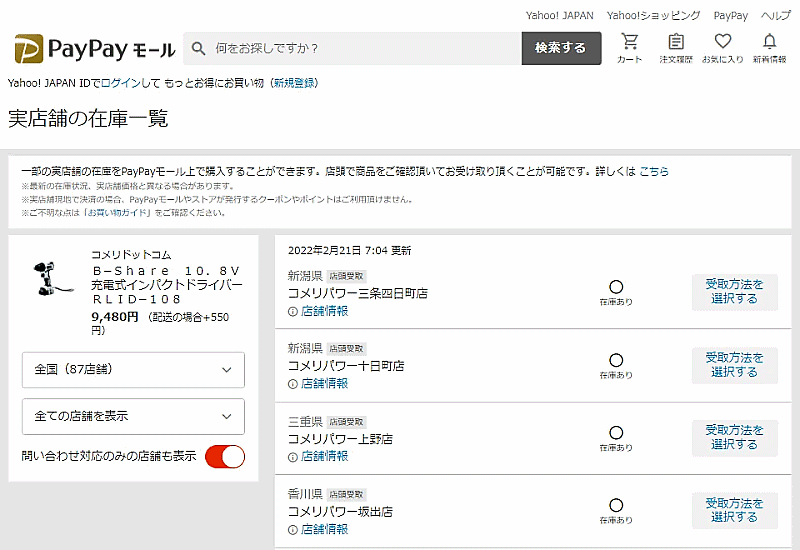 サービス対象商品には、検索結果や商品ページ上で「実店舗在庫」ラベルを表示、利用者は実店舗の在庫を確認することが可能。商品を受け取れる実店舗の地図も表示し、利用者は商品ページ内で一定エリア内の複数店舗の在庫状況を一度に確認できる。