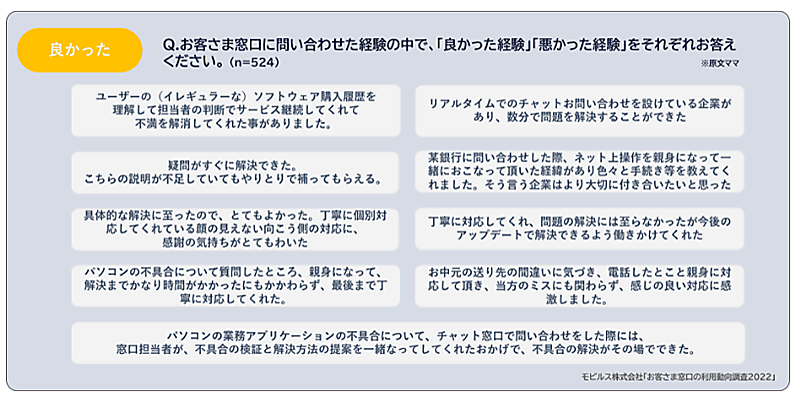 また、 「チャットで対応してくれた人が丁寧で良かった」「チャットですぐに解決できた」「いつでもどこでも問い合わせできて便利」といった、チャット対応を通して有人対応の良さと自動応答の便利さをそれぞれ感じている意見もあった。