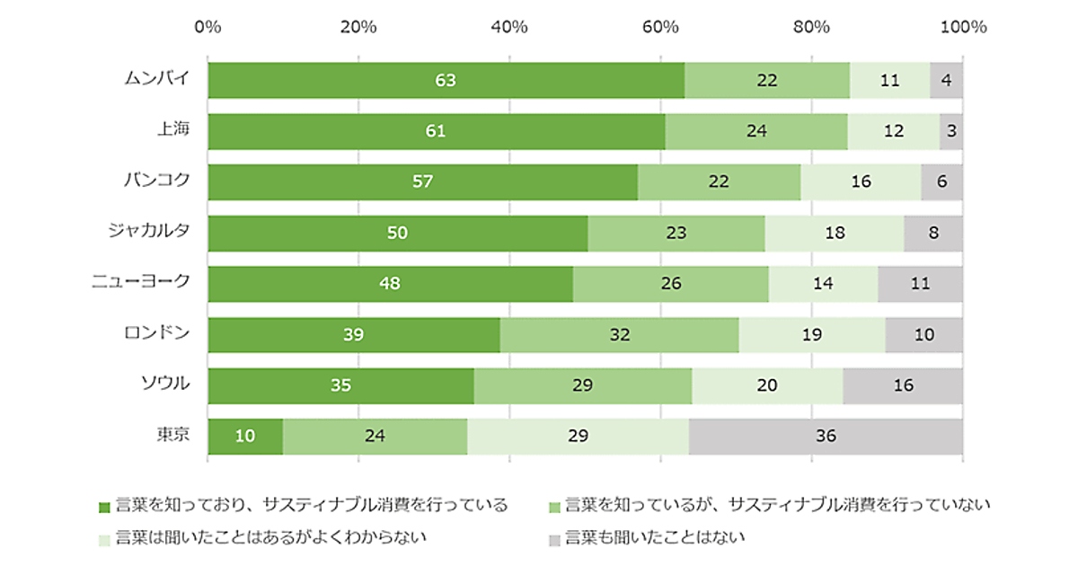 一方で、東京は「言葉も聞いたことがない」との回答が36%を占め、「サステナブル消費」を実践しているのは10%、理解度を含めて36%にとどまっている。ほかの7都市に比べると認知も実践も大きく遅れている実態が浮き彫りになった。
