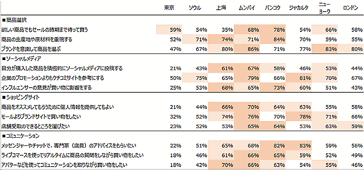 オンラインショッピングに対する意識を聞いたところ、上海・ムンバイ・バンコク・ジャカルタのアジア都市は、さまざまな手段を積極的に活用することで良い買い物をしたいというこだわりが強い。ソーシャルメディアやショップ側とのコミュニケーションへのニーズが高く、推奨されるための個人情報提供も60%以上が容認している。