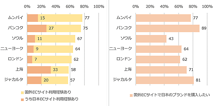 日本のECサイト利用率は上海(33%)が最も多く、バンコク(27%)、ジャカルタ(20%)が続いているが、ニューヨークとロンドンは10%未満。一方、越境ECによる日本ブランドの商品購入意向は各都市とも高く、ニューヨークとロンドンでも60%を超えている。