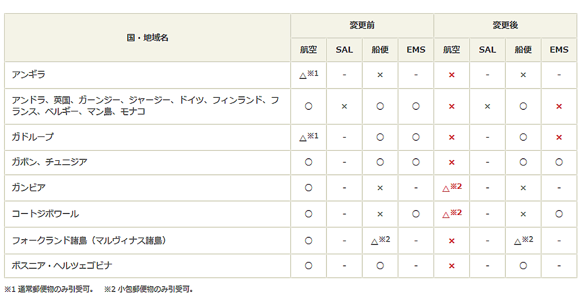 EMSの新規引き受け停止対象は、アンドラ、英国、ガーンジー、ジャージー、ドイツ、フィンランド、フランス、ベルギー、マン島、モナコ、ガドループ。