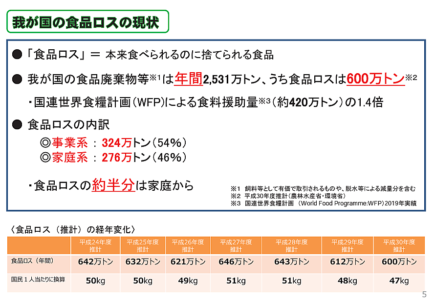 また消費者庁の発表では、日本の食品ロス量は年間600万トン(276万トンが家庭系、324万トンが事業系)で、毎日大型(10トン)トラック約1640台分が廃棄されているという。生活者が家庭でできる食品ロス削減の取り組みだけでなく、事業者側での食品ロス削減の取り組みが求められるとしている。