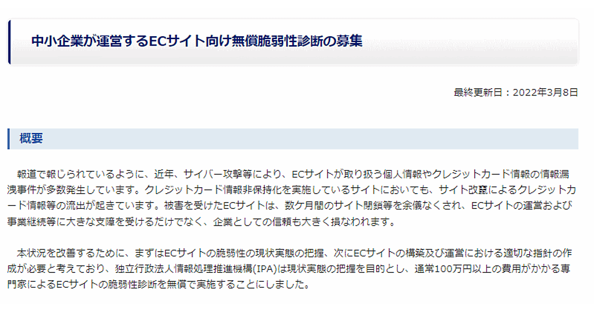 サイバー攻撃などでECサイトが扱う個人情報やクレジットカード情報の情報漏えい事件が多発していることを受け独立行政法人情報処理推進機構(IPA)は、専門家によるECサイトの脆弱(ぜいじゃく)性診断を無償で実施する。