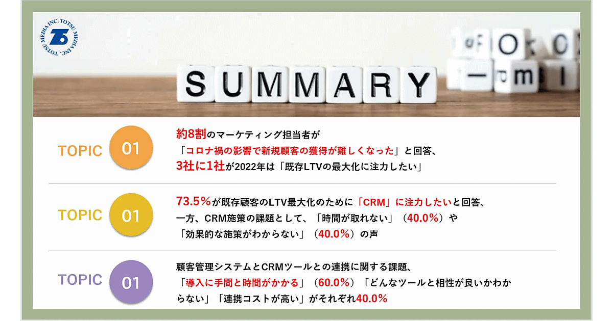 今回の調査結果について東通メディアは、新規顧客の獲得が難しくなったと考えるマーケティング担当者が、2022年の戦略として「既存LTVの最大化」に取り組んでいることが判明したと説明。CRM施策は時間不足、施策内容に悩んでいることもわかったという。