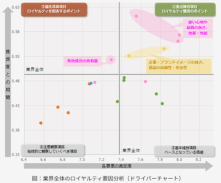 「企業イメージ・ブランドイメージの良さ」「商品の信頼性・安全性」といった企業やブランドのイメージや信頼性に関連した項目もロイヤルティに寄与。また「有効成分の含有量」も利用者の関心が高く、今後は利用者の期待に対する背景要因の探索や深掘りをしていくことが期待される。
