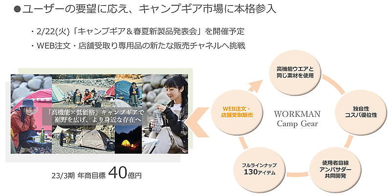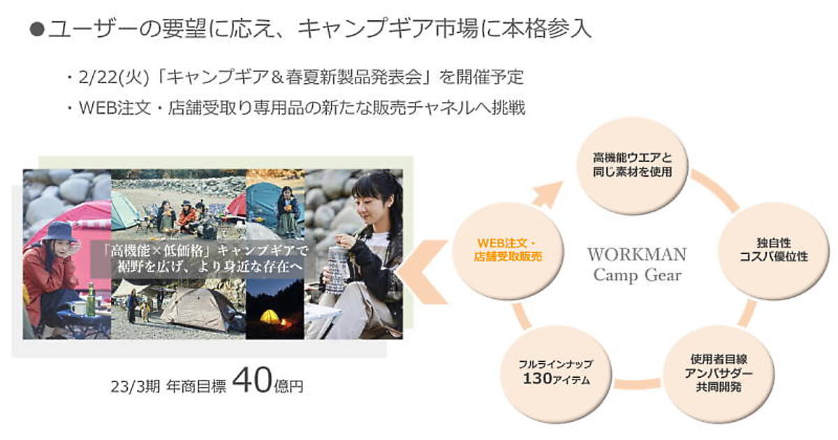 キャンプギアのEC注文専用品の初年度の販売見込みは40億円。テント、タープなどの主力製品は4か月で増産できるため、反応が良ければ55億円までの販売が可能とみている。