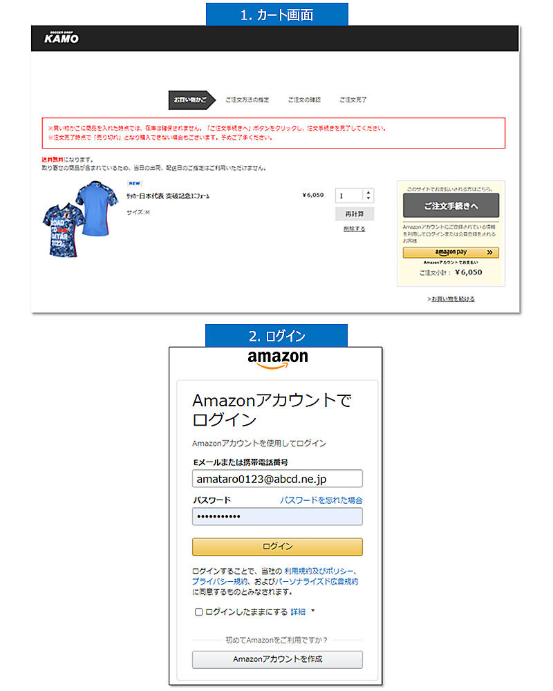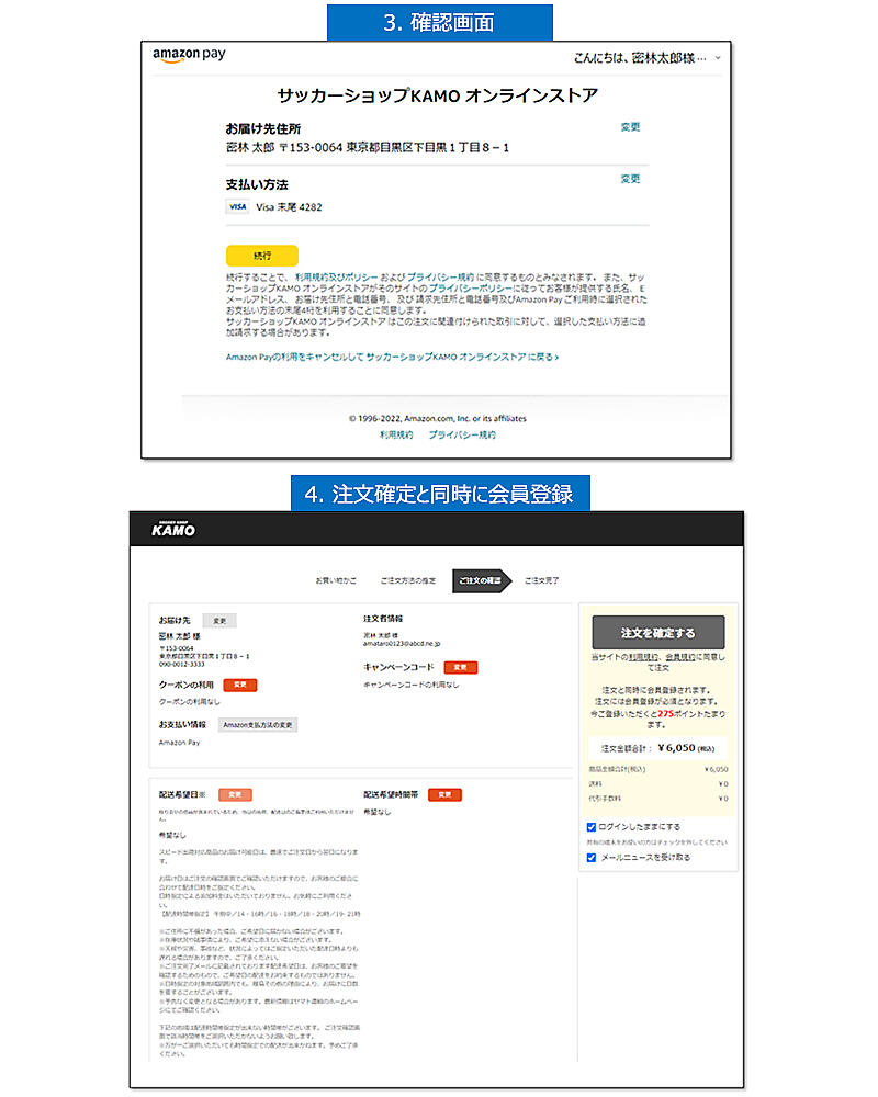 サッカー用品の専門店「サッカーショップKAMO」を手がける加茂商事は1968年の創業以来、「日本のサッカー文化の発展に貢献する」を社是としサッカーひと筋で事業を展開してきた。ファンの間では広く知られているが、あの日本代表元監督・加茂周氏の弟が創業したトータルフットボールカンパニーである。“生涯スポーツ”であるサッカーに関わる加茂商事の顧客1人ひとりに寄り添ったサービスを提供するための土台作りを担っているものの1つが、Amazonが提供するID決済「Amazon Pay」だという。2019年にECと実店舗の顧客データベースを統合すると同時に導入。2021年に新バージョン「Amazon Pay Checkout v2(CV2)」への切り替えと同時に会員登録を必須とするUIの変更を実施した。