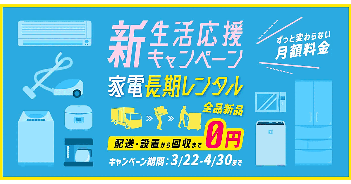 サービス開始記念として新生活応援キャンペーンを実施する。3月22~4月30日の期間、月額5500円(税込)の毎月定額料金で新生活に必要な家電レンタルに対応する。期間中は新品商品を届ける。