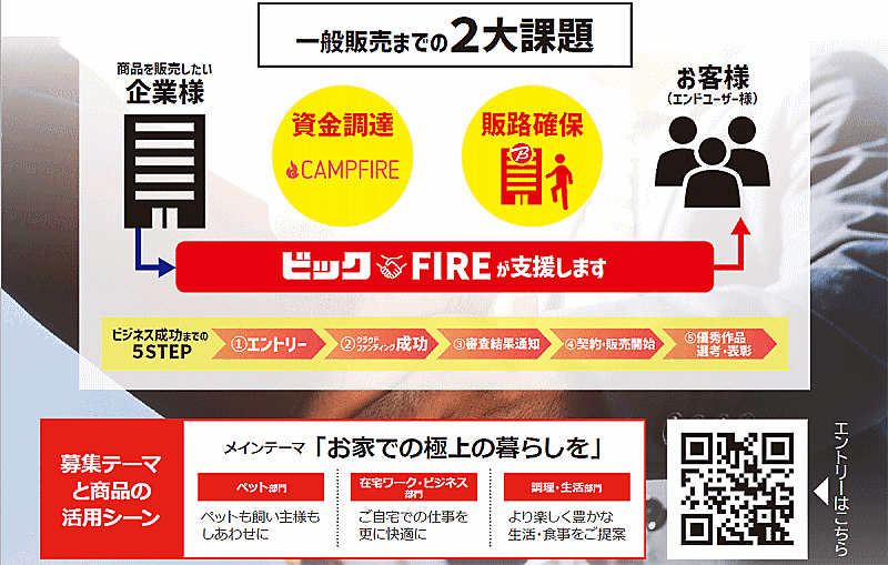 募集期間中に「CAMPFIRE」でクラウドファンディングプロジェクトを起案し「ビッグFIRE」にエントリー、成立資格を満たしビックカメラによる審査を通過した場合、ビックカメラの店舗やECなどの販路を提案する。