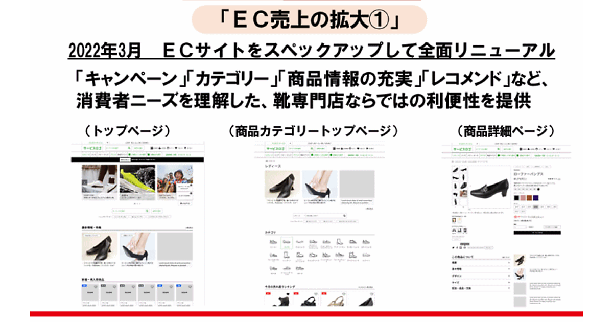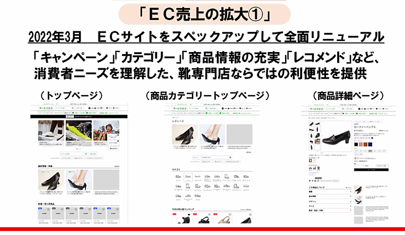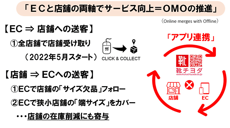 ECサイトは、店舗のサイズ欠品をフォロー、狭い小店舗の端サイズをカバーする役割を担い、実店舗の在庫削減にも寄与できるようにする。