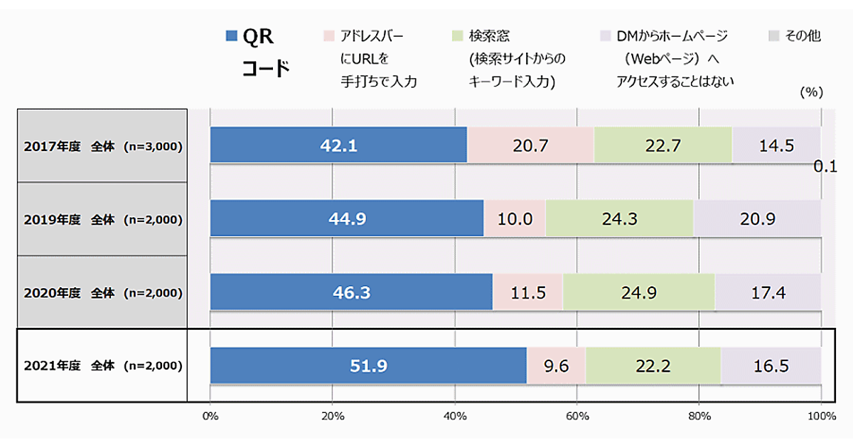 DMからWebへの遷移方法の比較において、QRコードでの遷移に対する好意度は継続的に上昇しており、2021年度調査では51.9%と過半数を超えた。
