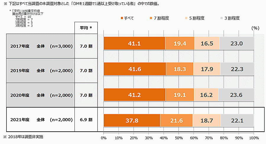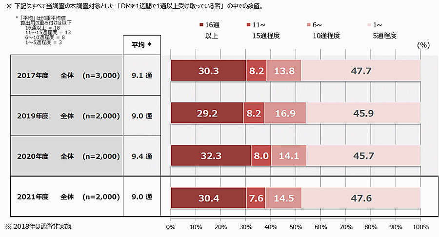 1週間に受け取るDMの通数は平均で9.0通、届いたDMの開封・閲覧割合は平均6.9割。2021年以前の調査結果と比較するといずれも横ばい傾向となった。1週間で受け取るDM数は「1~5通程度」が47.6%、「16通以上」が30.4%、「6~10通程度」が14.5%、「11~15通程度」が7.6%。