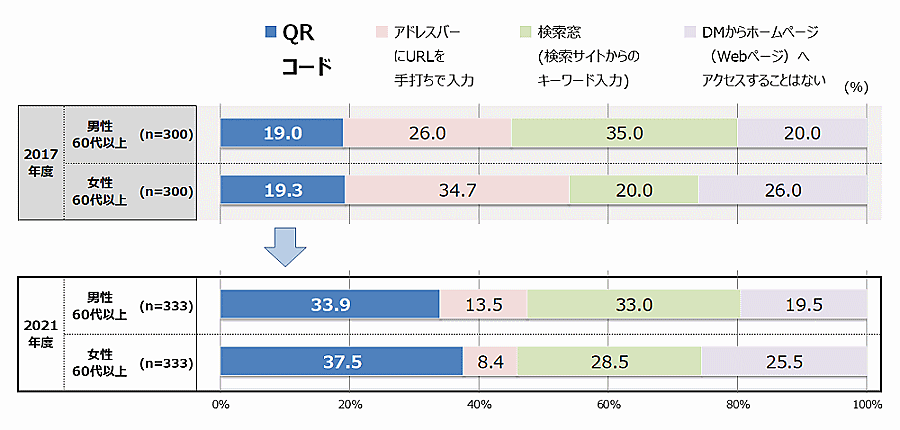 2017年と2021年の年代別回答を比較すると、QRコード遷移について、男性60代以上が33.9%、女性60代以上が37.5%となり、60代以上の利用意向の上昇が顕著となっている。スマートフォンの利用率が60代で39.4%から64.4%、70代で16.1%から35.6%へとそれぞれ上昇していることなどが影響したと推察している。