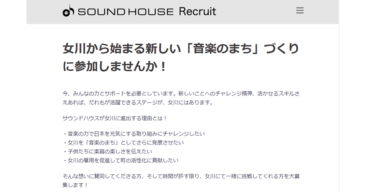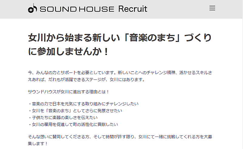 「音楽のまち」づくりに向けてスタッフ募集を行っているWebサイトでは、「音楽の力で日本を元気にする取り組みにチャレンジしたい」「女川を『音楽のまち』としてさらに発展させたい」「子供たちに楽器の楽しさを伝えたい」「女川の雇用を促進して町の活性化に貢献したい」という女川進出理由を説明している。