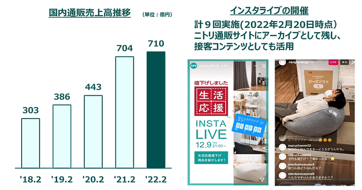 新たな販売チャネルの拡大として、ライブコマースでの販売「インスタライブ」を展開。「インスタライブ」は2022年2月20日時点で計9回実施し、ニトリの通販サイトにアーカイブ、接客コンテンツとしても活用している。