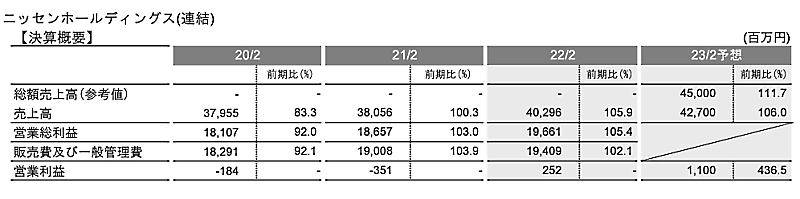 ニッセンホールディングスの2022年2月期における連結決算は、営業損益が2億5200万円の黒字(前期は3億5100万円の損失)に転換した。連結売上高は前期比5.9%増の402億9600万円。