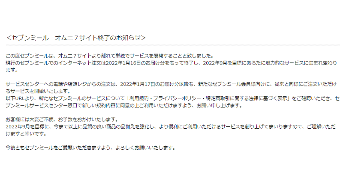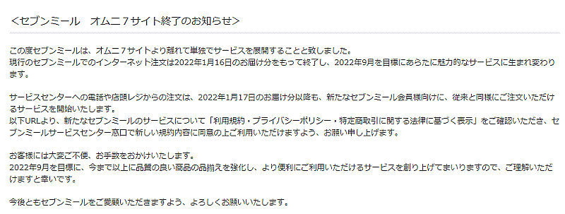 2022年1月16日配送分をもって「オムニ7」でのサービス提供を終了。コールセンター、店頭レジからの注文は現在も受け付けている。