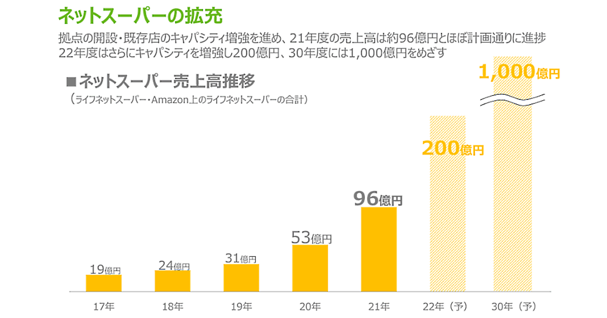 ライフコーポレーションの2022年2月期におけるEC売上高は前期比81.1%増の約96億円だった。拠点の開設や既存店のキャパシティ増強を進め、ほぼ計画通りに推移した。