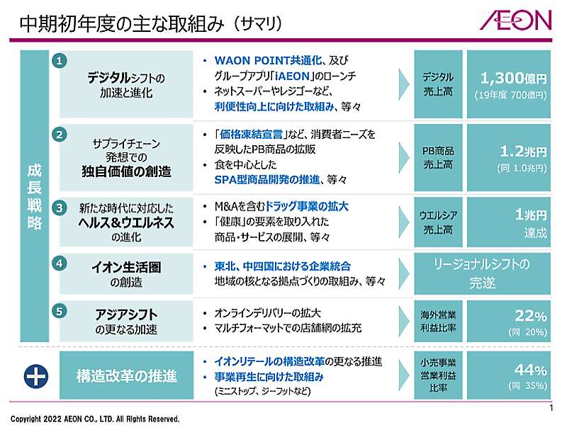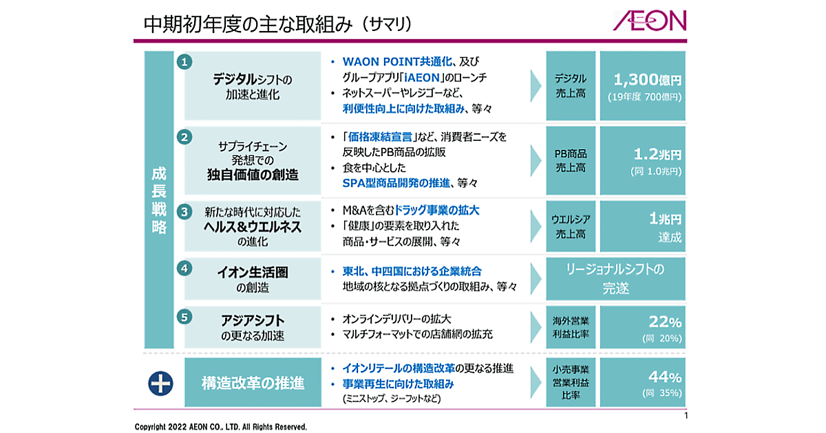2022年2月期は、カード払いで付与する「ときめきポイント」を「WAON POINT」に統一。イオングループの「決済」「ポイント」「店舗情報」を統合したグループ公式アプリ「iAEON(アイイオン)」をリリースした。