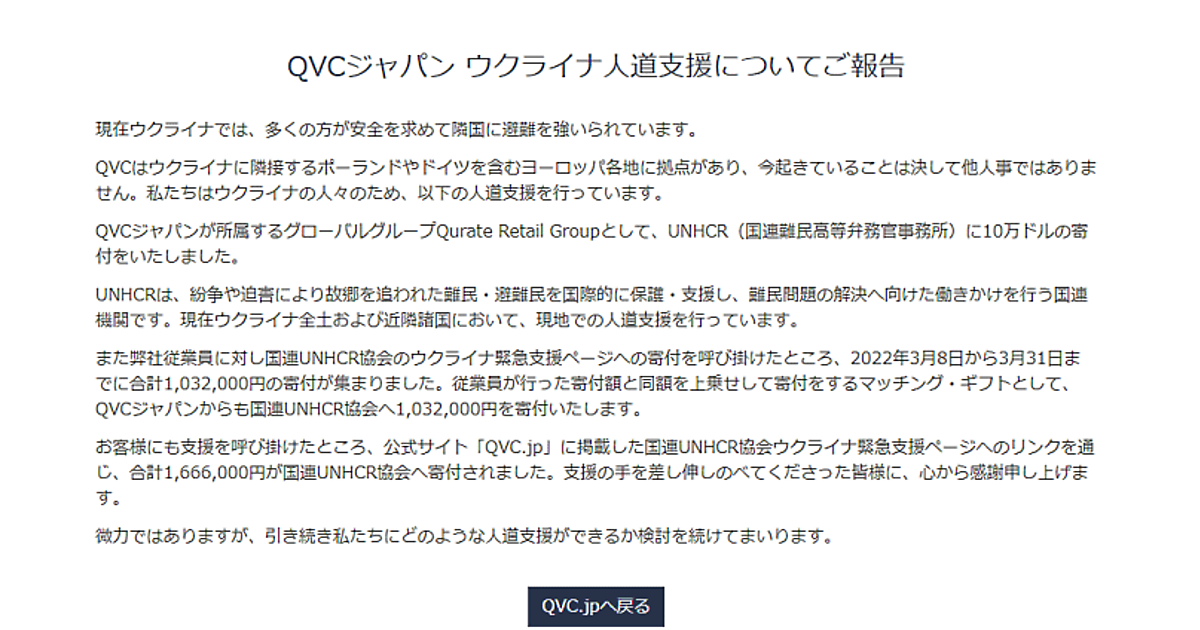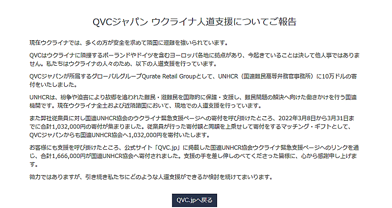 QVCジャパンでは、従業員向けに国連UNHCR協会のウクライナ緊急支援ページへの寄付を案内。スタッフが行った寄付額と同額をQVCジャパンが上乗せして寄付するマッチング・ギフトを1人当たり上限10万円で実施した。