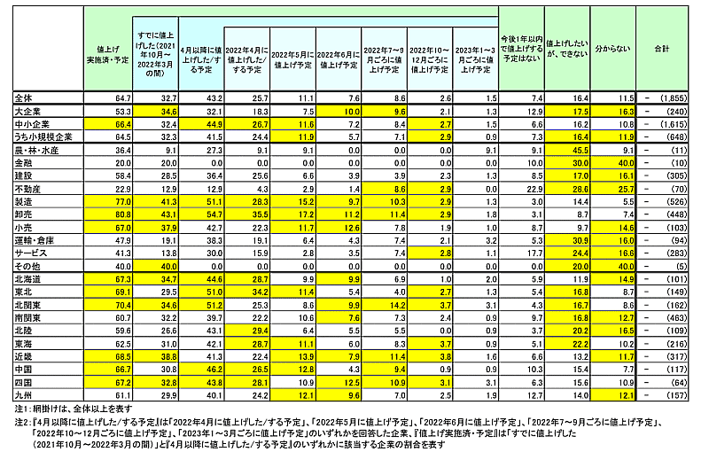 帝国データバンクが実施した今後1年の値上げ動向についてのアンケート調査によると、32.7%の企業が「2021年10月~2022年3月の間にすでに値上げした」と回答。