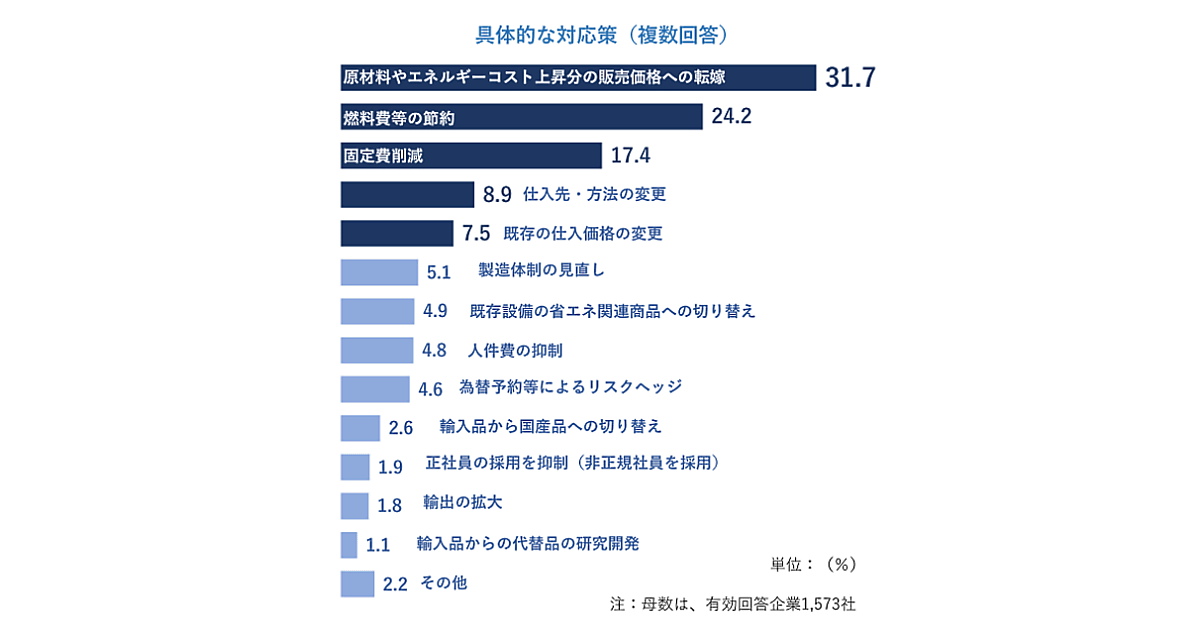 円安に対する具体的な対応策は、「原材料やエネルギーコスト上昇分の販売価格への転嫁」(31.7%)が3割台でトップ。「燃料費等の節約」(24.2%)「固定費削減」(17.4%)「仕入先・方法の変更」(8.9%)「既存の仕入価格の変更」(7.5%)が続いた。