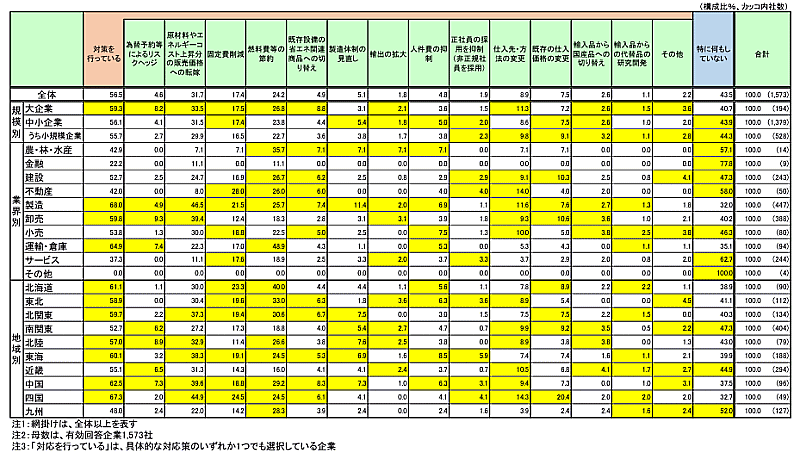 特に、製造業を中心に円安による仕入上昇分を販売価格へ転嫁しているケースが多い。「鉄鋼・非鉄・鉱業」(56.8%)「飲食料品・飼料製造」(52.3%)「化学品製造」(50.0%)などでは5割を超える企業で製品価格に転嫁している。