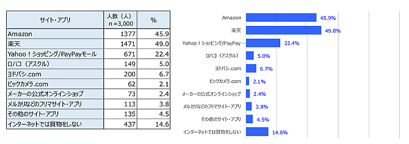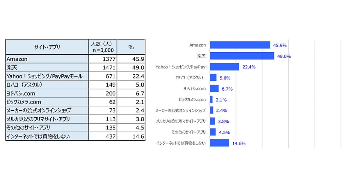 男女とも85%以上がインターネットを利用。最も多かったのは「楽天市場」で49.0%、「Amazon」が45.9%で2位。3位は「Yahoo!ショッピング/PayPayモール」の22.4%だった。