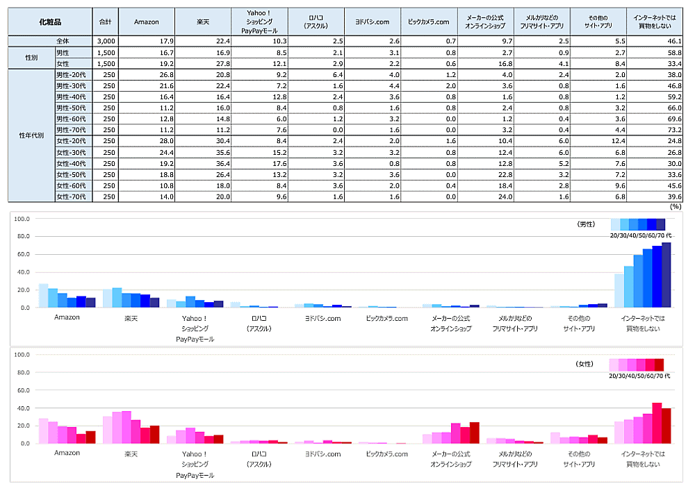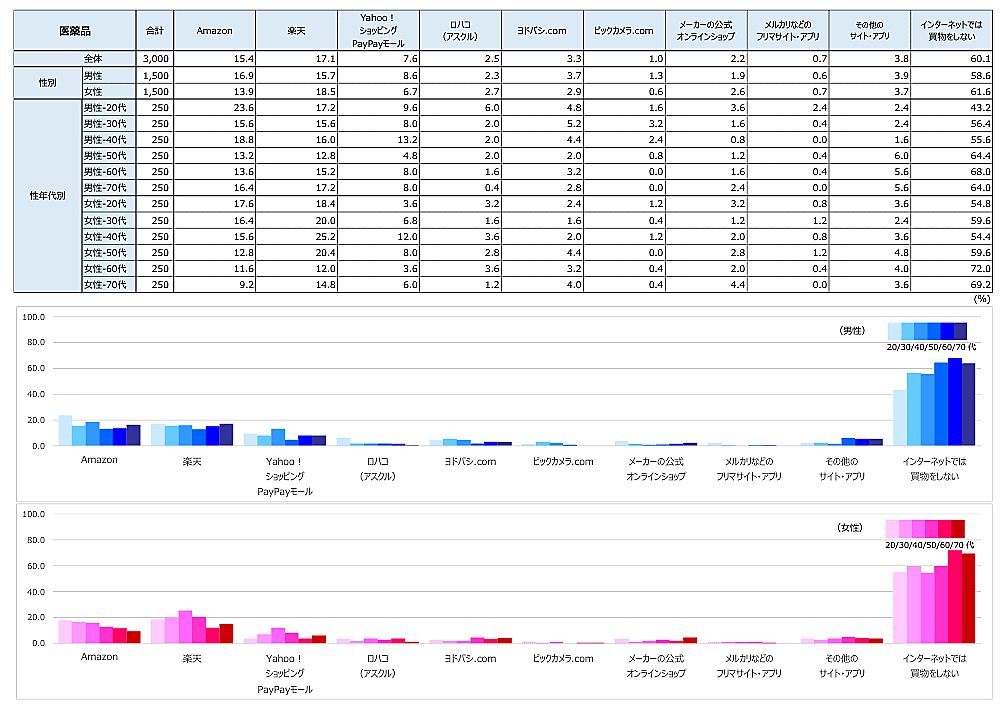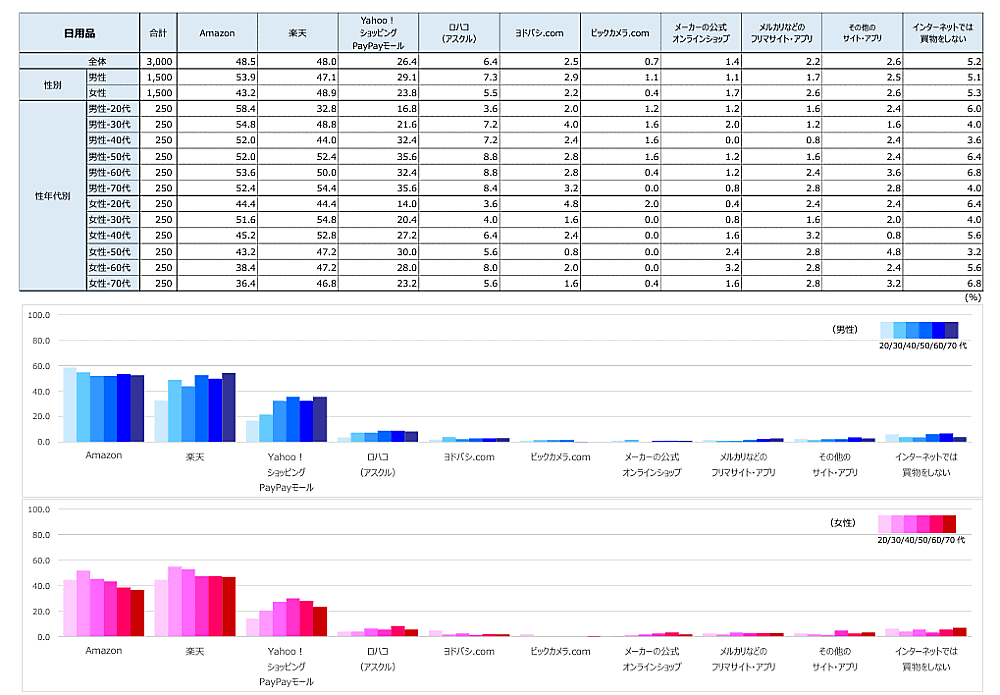 この記事では、インターネットで買い物をする際、日用品・化粧品・食品・医薬品についてどのサイトやアプリを利用しているか調べた調査結果を取りあげる。