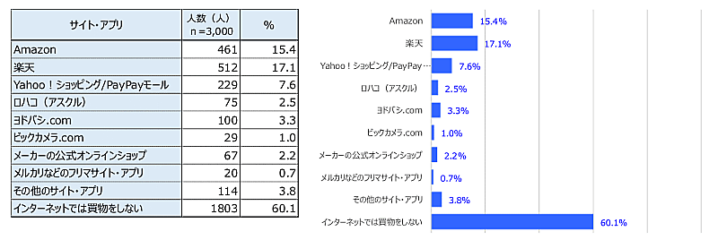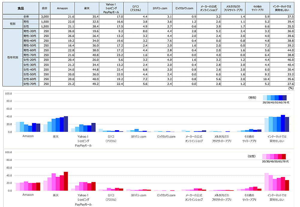 利用サイトでは「楽天市場」が35.4%で最多。「Amazon」は21.6%だった。男女とも「楽天市場」の利用比率が高く、「Amazon」を10ポイント以上引き離している。