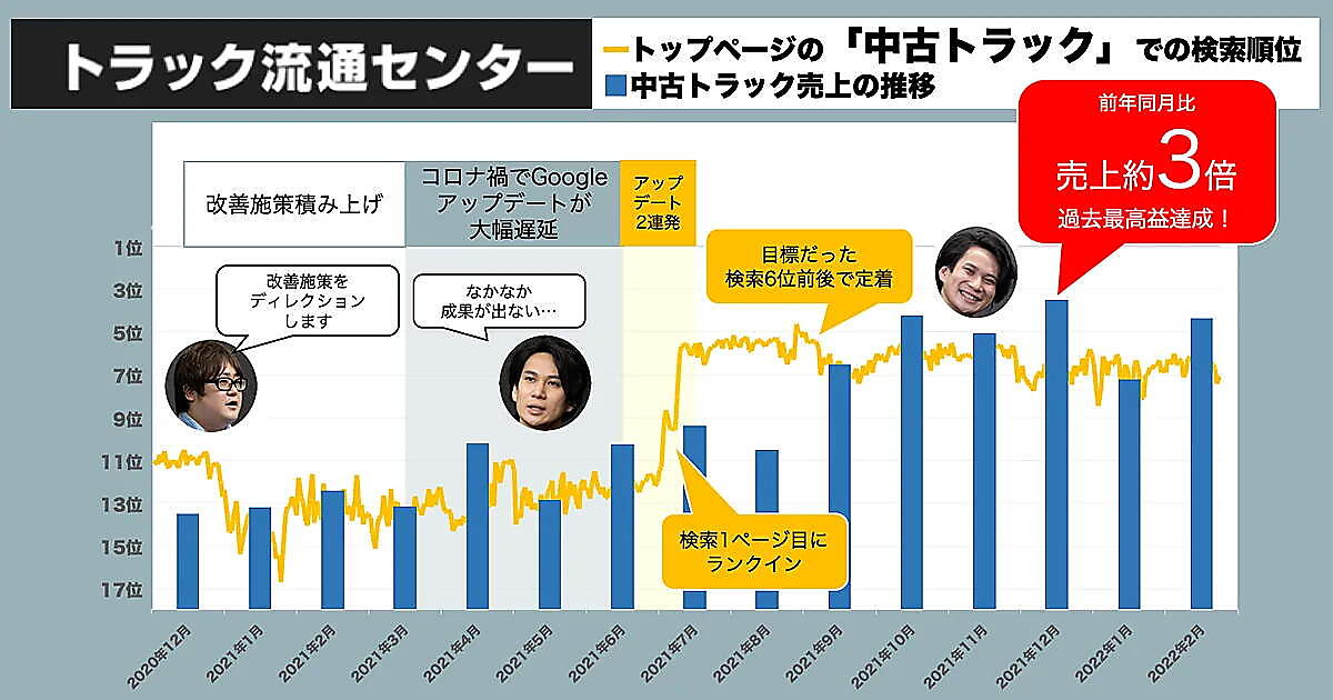 ROIは298%も向上し、中古トラックの売上は施策前の前年同月比約3倍に。途中、コロナ禍でGoogleアップデートの遅延もあり、関係者一同「成果が出るまで、本当にドキドキでした…!」と語る施策を、振り返ってもらった。