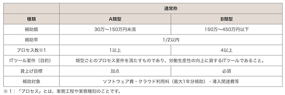 業務プロセスの労働生産性向上に貢献するITツールを導入した際に、ソフトウェアの費用やクラウド利用料(最大1年分補助)、導入関連費などが補助されます。ITツールの対象となる業務プロセスの範囲や、ITツール導入後の賃上げ目標の条件などによって「A類型」と「B類型」に分かれます。