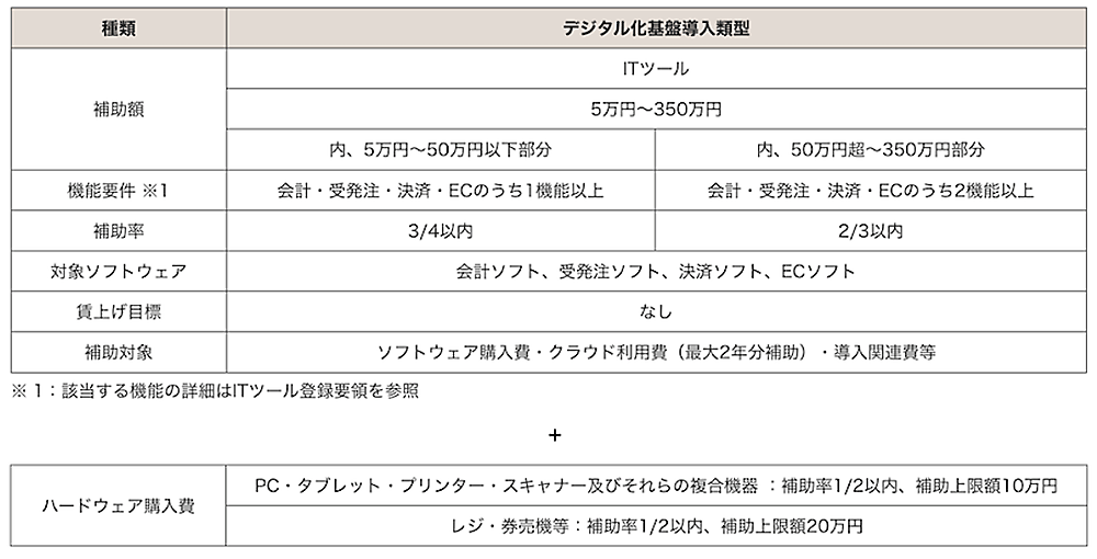 デジタル化基盤導入枠(デジタル化基盤導入類型)とは、会計ソフト・受発注ソフト・決済ソフト・ECソフトの導入に限定した特別枠です。ソフトウェアの導入費用だけでなく、PCやタブレット、スキャナ、レジなどハードウェア購入費用も補助の対象です。