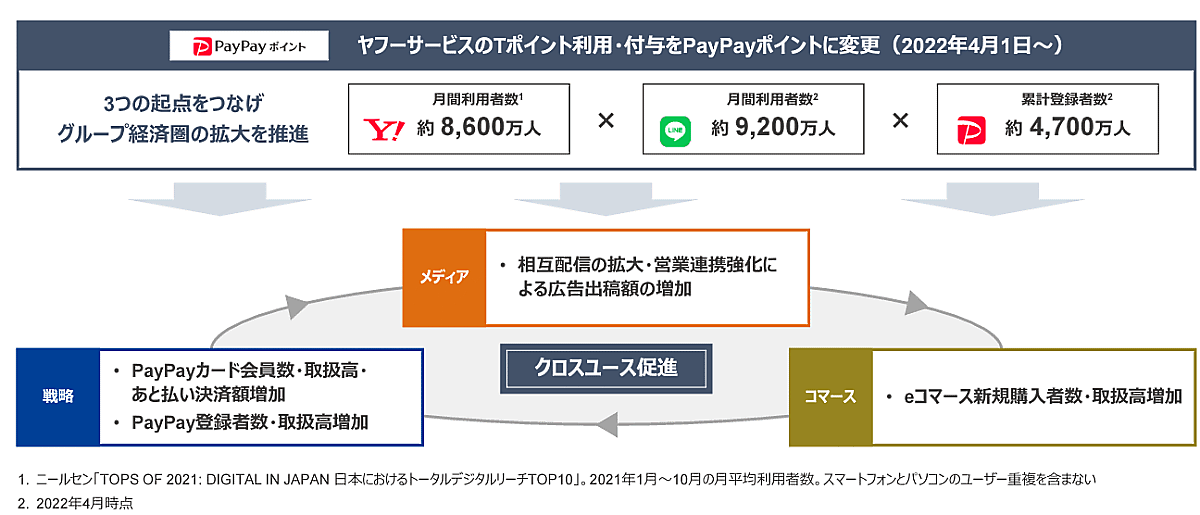 ロイヤリティプログラムの統一に向け、ヤフーサービスのTポイント利用・付与をPayPayポイントに変更。ヤフー、LINE、PayPayという3サービスの起点をつなげ、クロスユースの促進とグループ経済圏の拡大を図る。