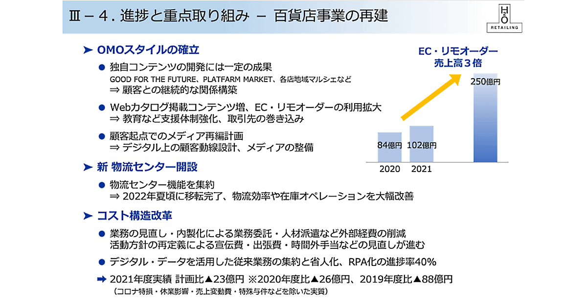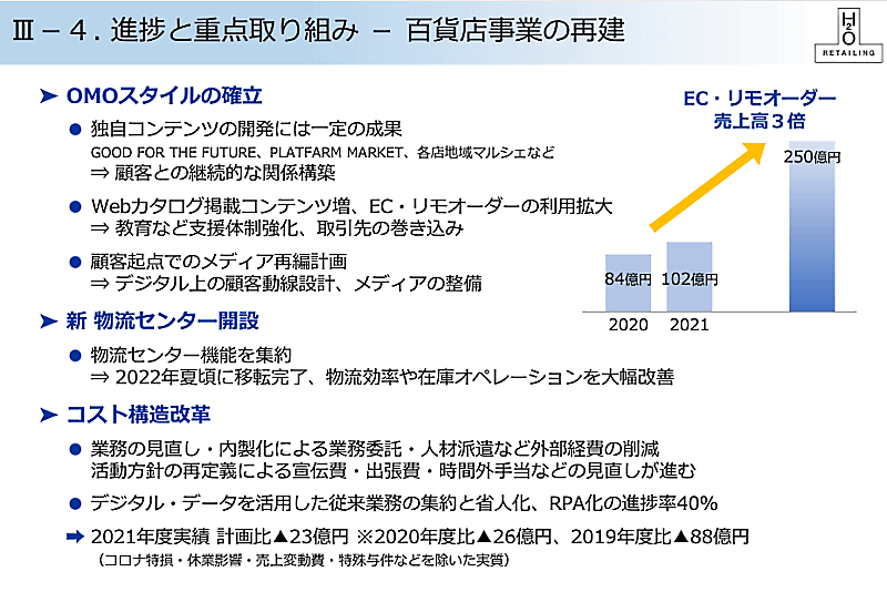 エイチ・ツー・オー テイリングの2022年3月期におけるEC売上高は、前期比21.4%増の102億円だった。