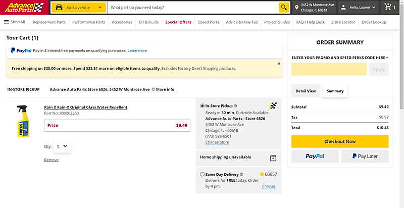 Advance Autoには指定されたスペースはありませんでしたが車を停車。店の窓には、受け取りに関するその場しのぎの看板がありました。店員は私が商品を取りに来たことに困惑しているようでしたが、すぐに参りますと言いました。店員によると、棚卸の最中ということで、そのせいで混乱していたのかもしれません。