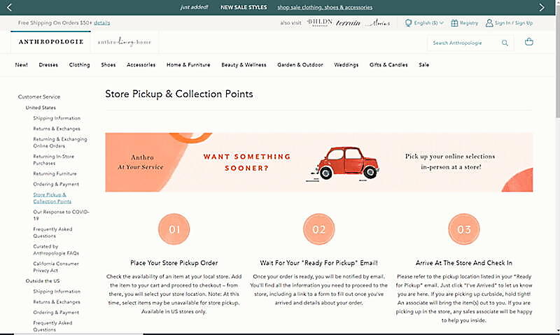Anthropologie(衣料品小売店)は急いでいる消費者のために、カーブサイドピックアップサービスをECサイトで可視化し、プロセスを明確に示しています。