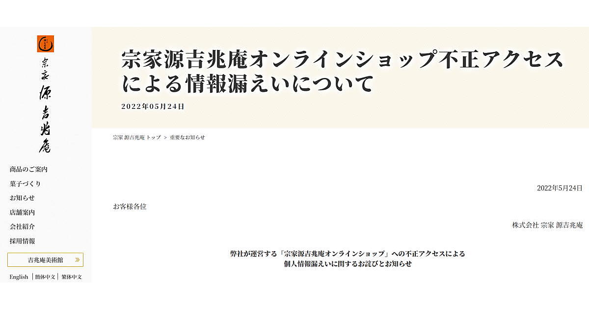 2022年3月7日、一部のクレジットカード会社からECサイトを利用した消費者のクレジットカード情報の漏えい懸念について連絡があり、外部からのアクセスを遮断。「宗家源吉兆庵オンラインショップ」でのカード決済を停止した。