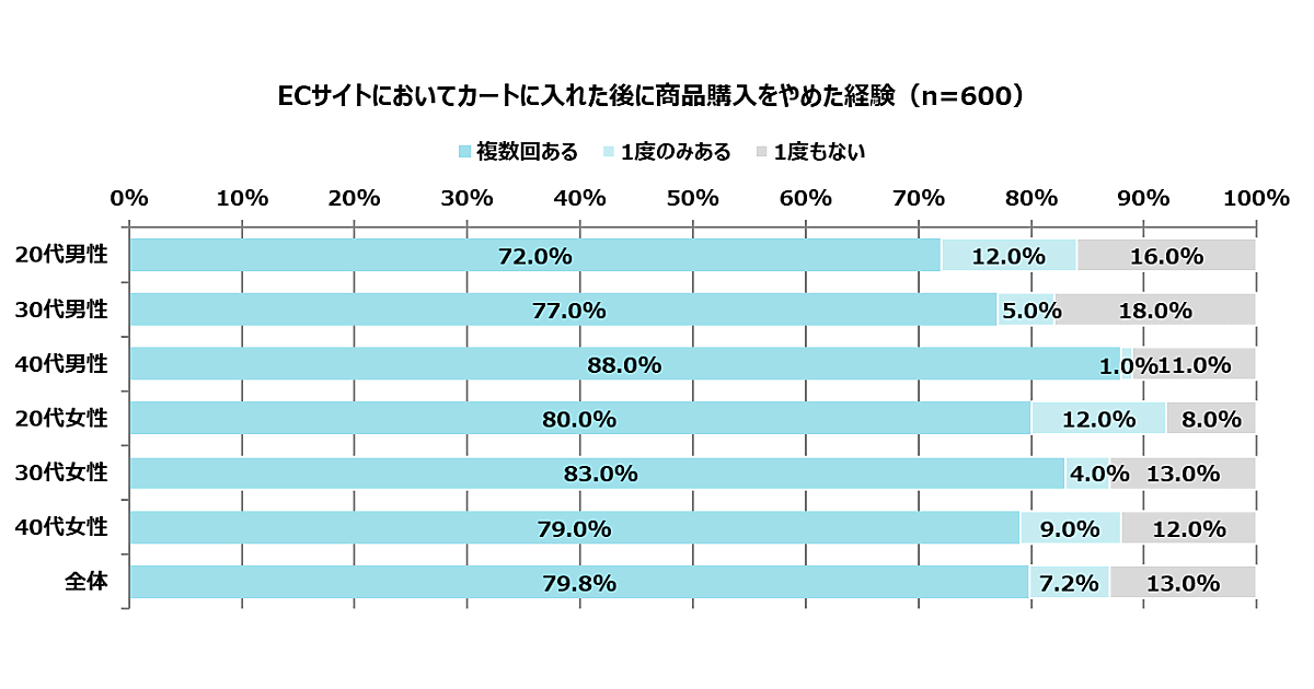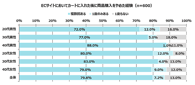 ECサイトを利用する際にカートに入れた後に商品購入をやめた経験があるかを聞いた質問には、回答者600人のうち「複数回ある」が79.8%、「1度のみある」が7.2%。合計で87.0%がカートに入れた後に購入直前で取りやめた経験があることがわかった。