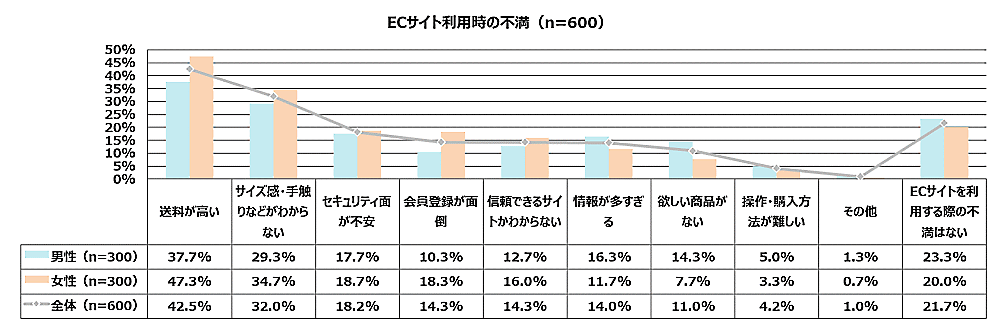 ECサイトを利用する際の不満を聞いた質問では、「送料が高い」が42.5%と最も多かった。次いで「サイズ感・手触りなどがわからない」が32.0%となった。