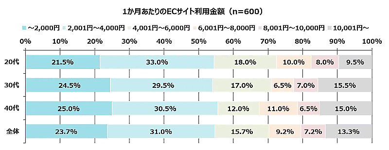 1か月当たりのECサイトの利用金額を聞いた質問では、「2001円~4000円」が最も多く31.0%。次いで「~2000円」が23.7%となり、半数以上の人が4000円以内の利用だった。