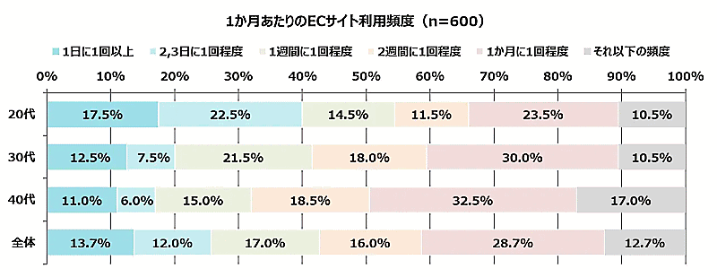 1か月あたりのECサイトの利用頻度を聞いた質問には、「1日1回以上」が13.7%、「2、3日に1回程度」が12.0%、「1週間に1回程度」が17.0%。42.7%の人が「1週間に1回以上」ECサイトを利用している。