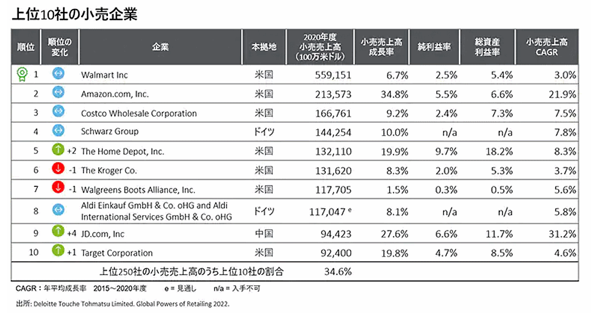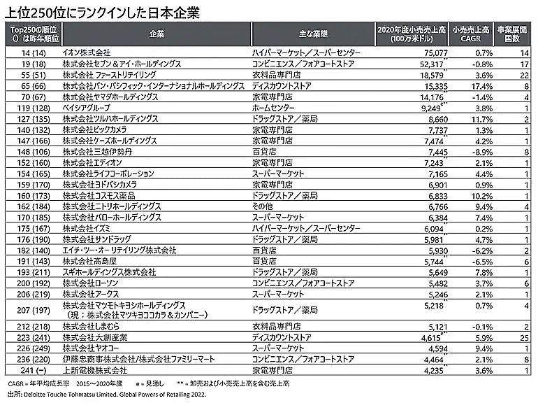デロイト トーマツ グループは、全世界の小売企業から2020年度(2021年6月30日までを期末とする事業年度)の売上高上位250社のランキングを地域別、商品セクター別に分析した「世界の小売業ランキング2022」を発表した。